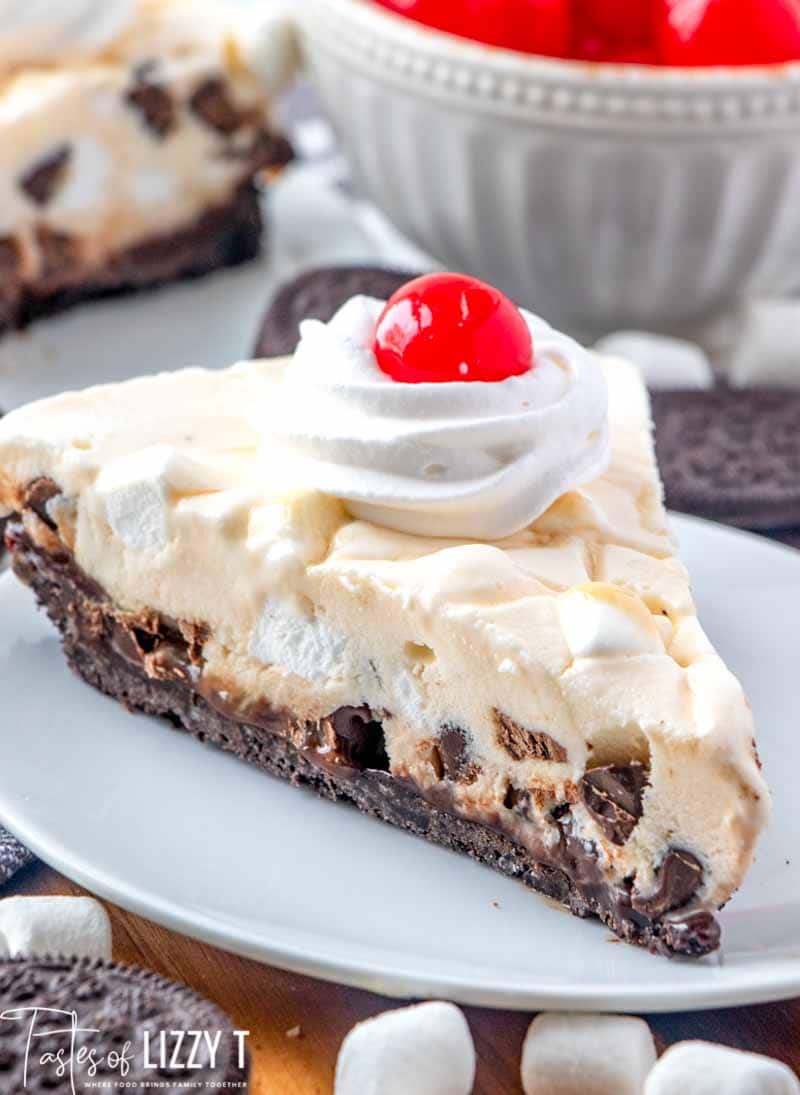 An ultimate ice cream pie with a Oreo cookie crust and homemade fudge sauce. The vanilla ice cream is stuffed with chocolate chips and marshmallows.