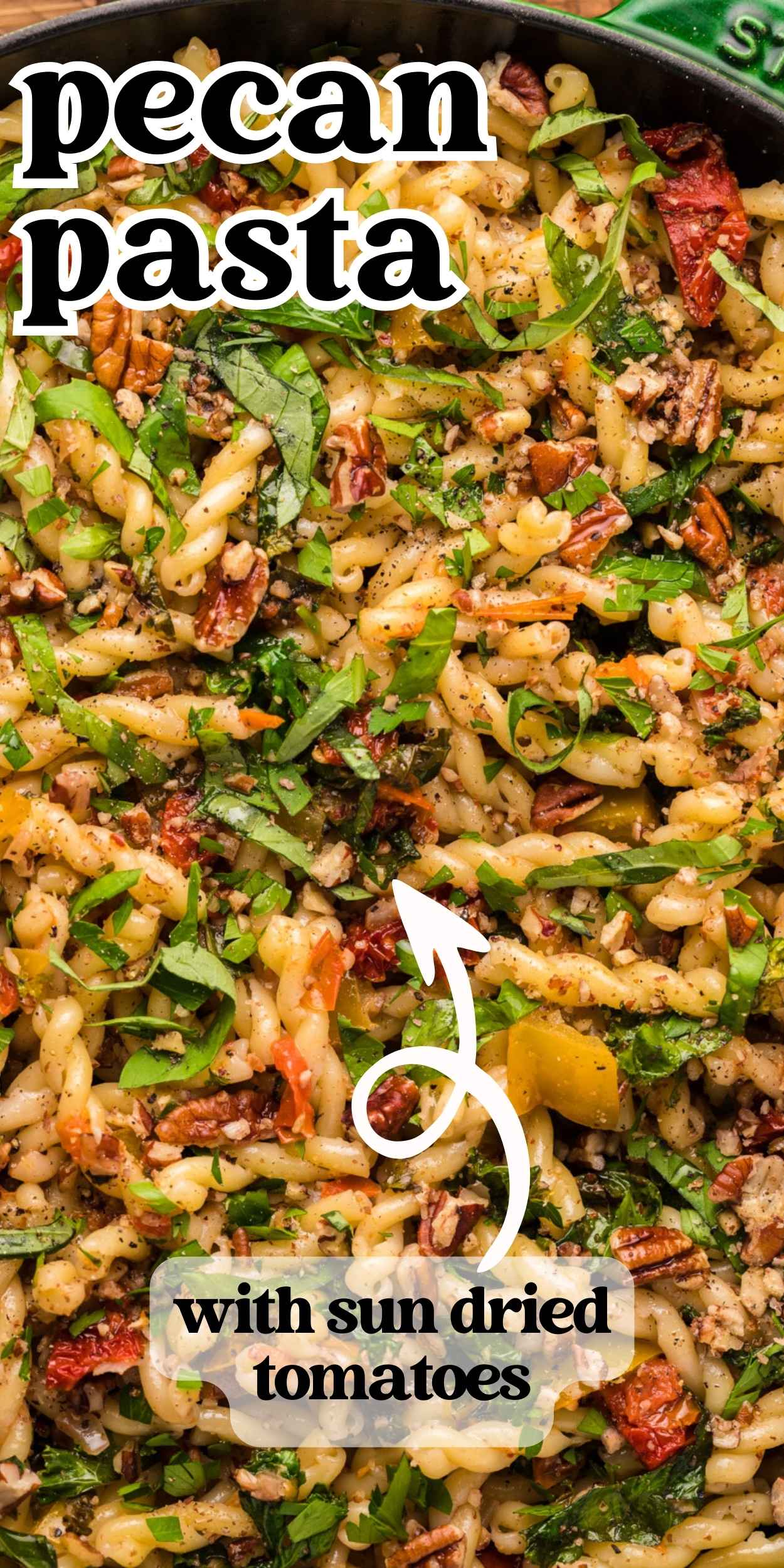 Pecan Pasta with sun dried tomatoes is a quick and delicious dish ready in under 30 minutes. Loaded with pecans, tomato, pepper and fresh herbs.