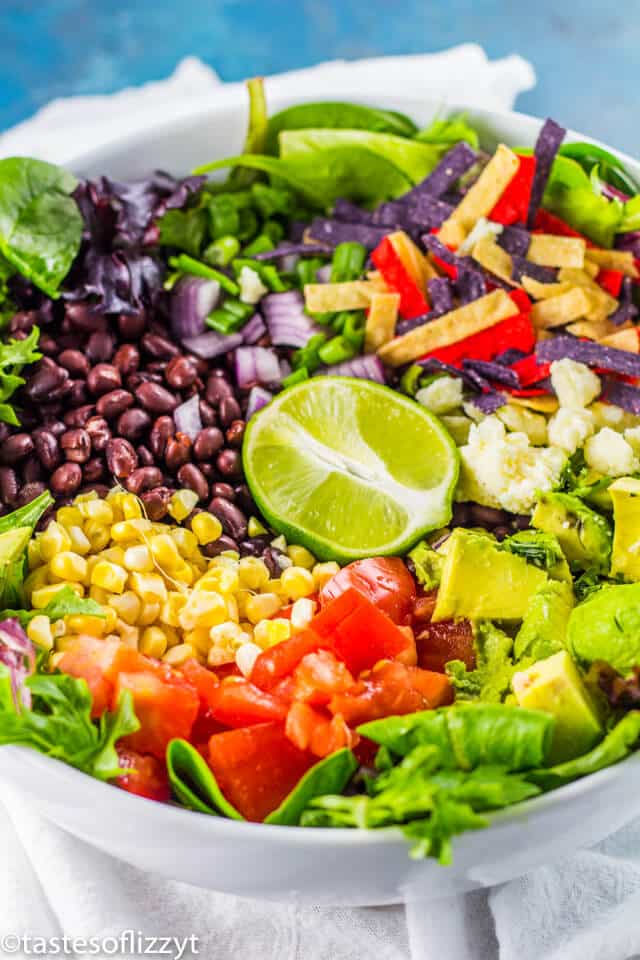 - Place spring mix in a large bowl. Add black beans, tomatoes, corn, red onion, avocado, green onion, cilantro, cotija cheese and tortilla strips in a large bowl. Combine.