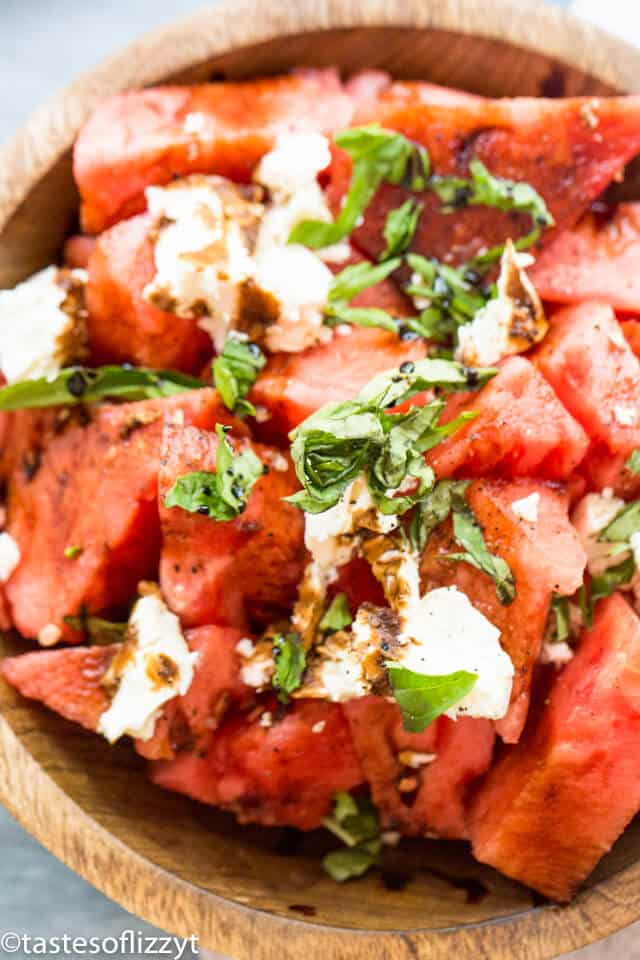 Nothing says summer picnic like this easy watermelon salad recipe. With fresh watermelon and basil, a sprinkling of feta cheese and a savory balsamic reduction, this easy summer side dish is cool and refreshing!