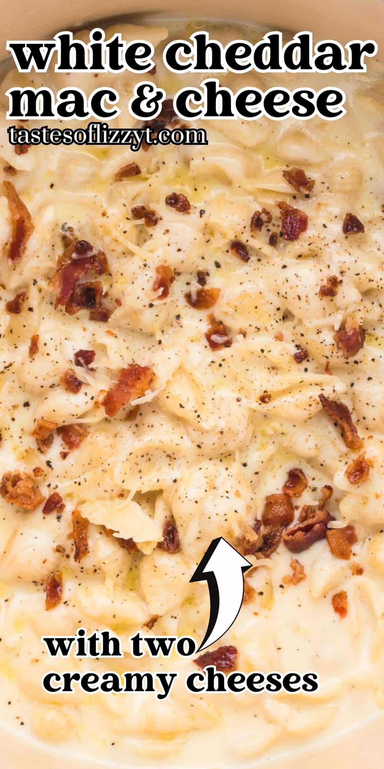 - Transfer the creamy white cheddar mac and cheese to a serving dish or individual bowls. Sprinkle with the chopped bacon and some fresh cracked black pepper. 3 strips of cooked bacon