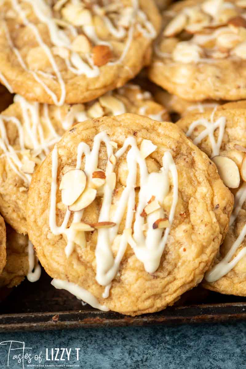 - Drizzle the top of the cooled cookies with white chocolate and sprinkle with sliced almonds. We LOVE doing this to cookies because it makes them look so fancy.