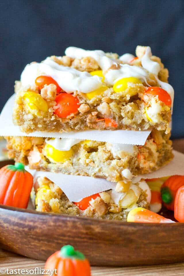 So good that I had to send the pan of cookie bars away as soon as I was done photographing them. You see, the kids were going to be gone that afternoon.  And me, by myself, in a house with a pan of these salty & sweet treats? There was just no way I was going to be able to keep from downing the whole pan by myself. I’m thankful for Grandmas and Grandpas who are willing to take some of our goodies off our hands. 🙂 And when you can’t find Candy Corn M&M’s anymore, no worries. Just use white chocolate chips!