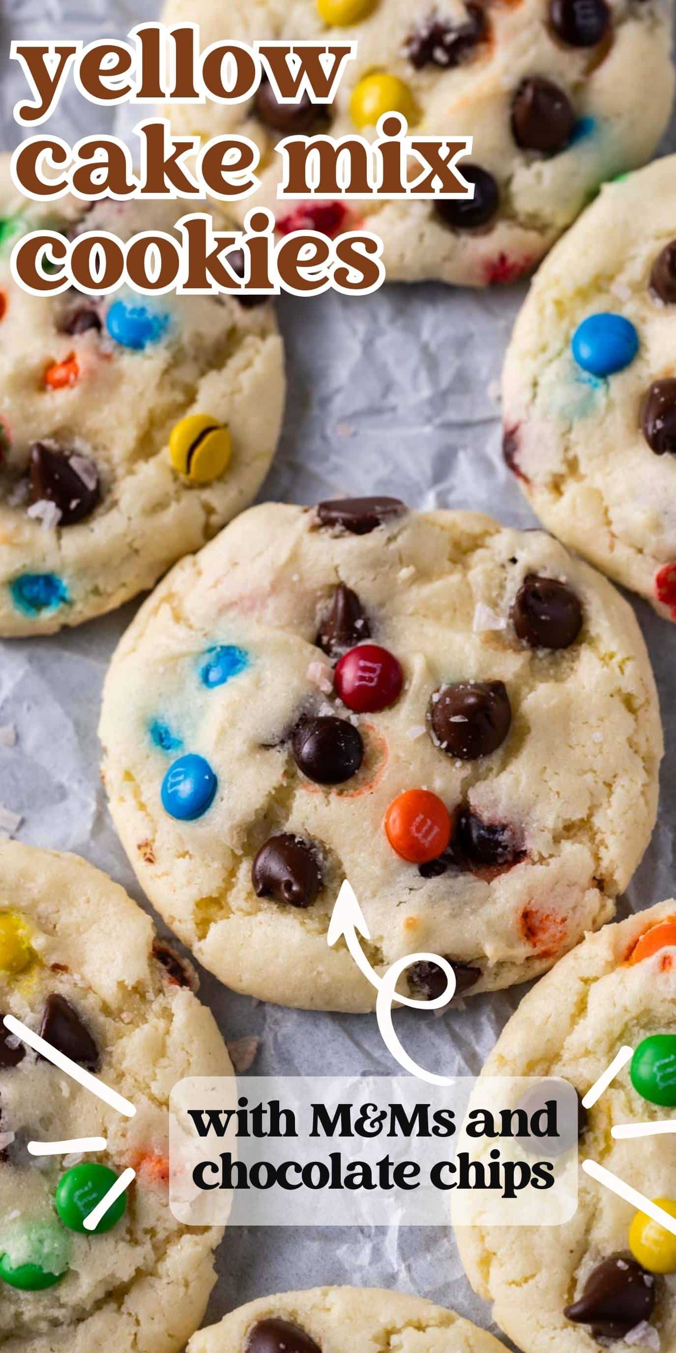 Kids will love joining you in the kitchen to make these Yellow Cake Mix Cookies with mini M&Ms and chocolate chips. They taste like birthday cake!